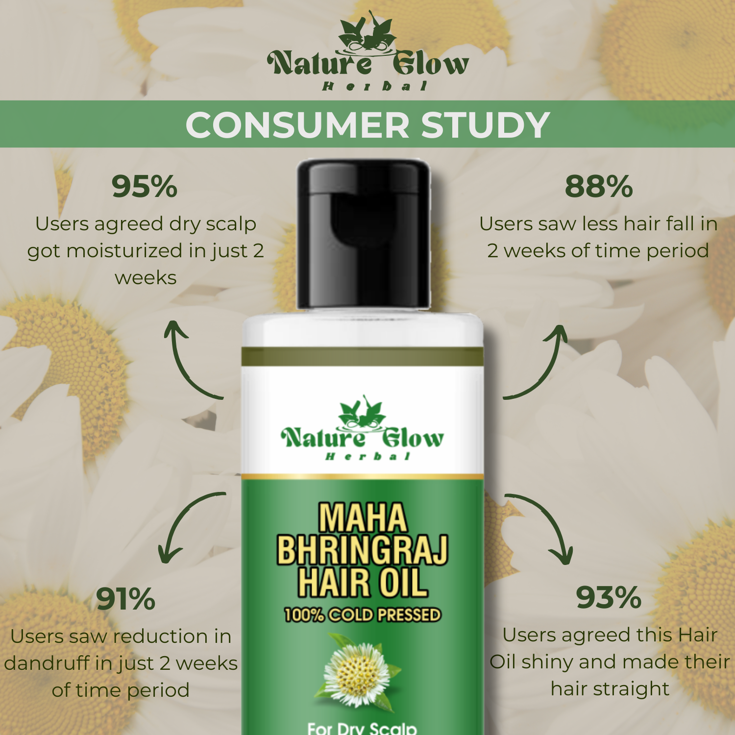 ◻ Description:Nature Glow BHRINGRAJ Hair Oil is an Ayurvedic formula that has been carefully crafted to provide nourished and strong hair growth, revitalising your hair. Bhringraj is one of the special natural ingredients in our blend that works to boost the growth of hair follicles and increase healthy, luscious hair.With regular use, you'll deeply nourish your scalp, fortify your roots, and stop hair loss. Enjoy the return of your hair's natural sheen and the removal of dandruff because of our BHRINGRAJ Hair Oil's calm and hydrating qualities.Our formula, in contrast to other products, is devoid of dangerous chemicals, guaranteeing a mild and efficient solution for your hair care regimen. Use Ayurvedic medicine to transform your hair, and go for Nature Glow BHRINGRAJ Hair Oil to get the healthy, lustrous hair you've always desired.