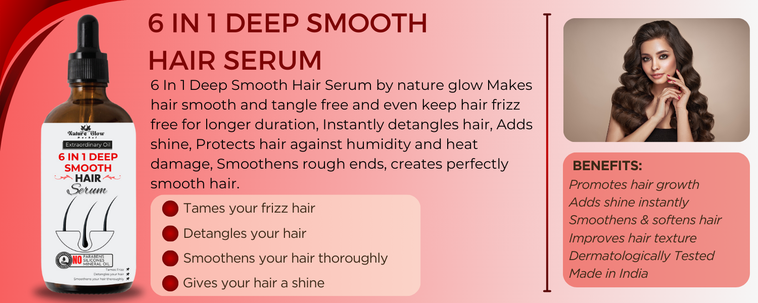 ✅6 IN 1 DEEP SMOOTH HAIR SERUM:-With Nature Glow 6-in-1 Deep Smooth Hair Serum, treat your hair to the opulent care it deserves. With its revolutionary formula, your hair will be transformed while receiving intense hydration, nourishment, and unmatched smoothness. Our serum, which is enriched with a combination of natural extracts and vital vitamins, works to revitalise your hair from the inside out, encouraging a lustrous and well-groomed mane. Bid farewell to unruly, frizzed-out hair. In addition to reducing frizz, our cutting-edge smoothing technology shields your hair from heat damage from styling tools. The formula's light weight and lack of grease guarantee that your hair will feel smooth, silky, and residue-free. Use Nature Glow 6-in-1 Deep Smooth Hair Serum to take your hair care regimen to the next level. Our special blend is made to give your hair intense nutrition, leaving it smooth, silky, and incredibly healthy. This hydrating serum, enhanced with organic ingredients like Vitamin E and Argan Oil, leaves hair looking healthy and glossy.Discover the transforming power of our frizz-control technology, which tames wild hair and produces a polished, streamlined finish. Concerned about styling tools causing heat damage? Do not fear! Our serum functions as a shield to keep your hair safe and gorgeous.This adaptable serum is great for all hair types and works well on both wet and dry hair. It's a must-have for any daily styling regimen.