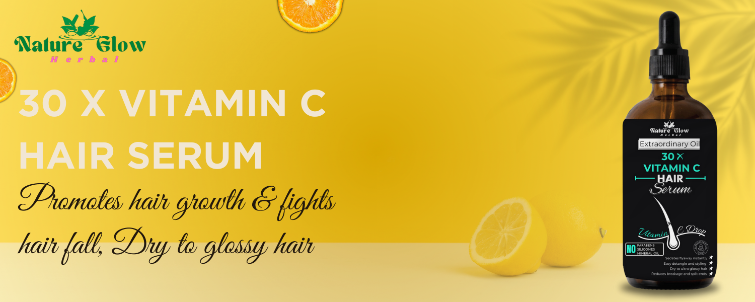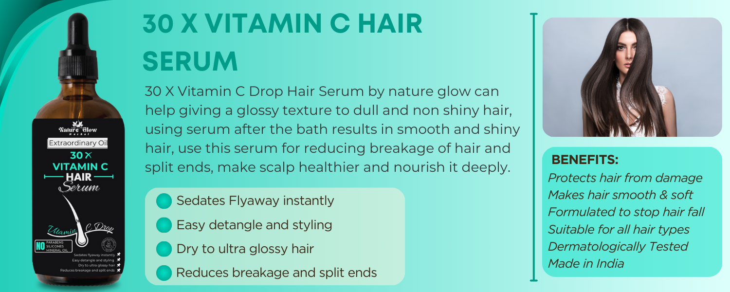 ✅30X VITAMIN C DROP HAIR SERUM:-With Nature Glow 30X Vitamin C Drop Hair Serum, you can completely change your hair care regimen. Our special recipe uses the power of Vitamin C to give your hair a powerful nutrition boost. Observe the stunning metamorphosis of your hair as it becomes lustrous and silky-smooth. This serum works deep within the hair shaft to strengthen and revitalise from the ground up, going beyond simple aesthetics. Say good-bye to frizz and flyaways, as Vitamin C's anti-frizz properties take charge and leave your hair smooth and easy to manage. Our serum, which is more than just a cosmetic treatment, puts scalp health first by delivering vital nutrients for increased vigour. Your hair appears brighter and more vibrant thanks to the natural radiance boost. In order to produce a smoother, simpler to manage texture, our hydrating formula causes sure that every strand arrives the moisture it needs via boosting elasticity and decreasing breakage.