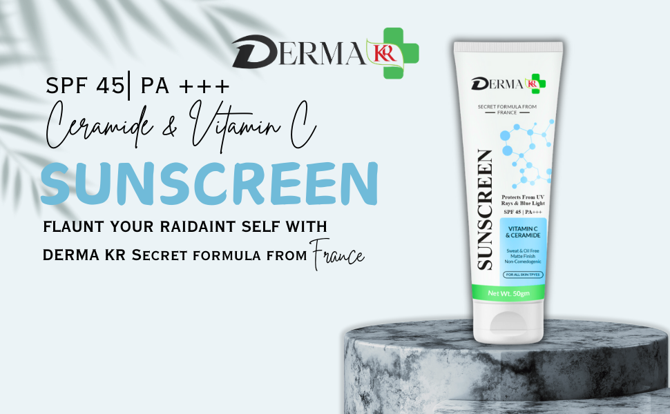 Description:-Sunscreen:-DERMA KR sunscreen cream is designed to offer comprehensive protection while enhancing your skin's natural radiance and resilience. Carefully crafted for daily use, CeraGlow Radiant Shield SPF not only guards against harmful UV rays but also nourishes, hydrates, and revitalizes your skin. CeraGlow Radiant Shield SPF provides robust broad-spectrum protection, shielding your skin from both UVA and UVB rays. UVA rays penetrate deep into the skin, causing premature aging and wrinkles, while UVB rays are responsible for sunburn and skin damage.