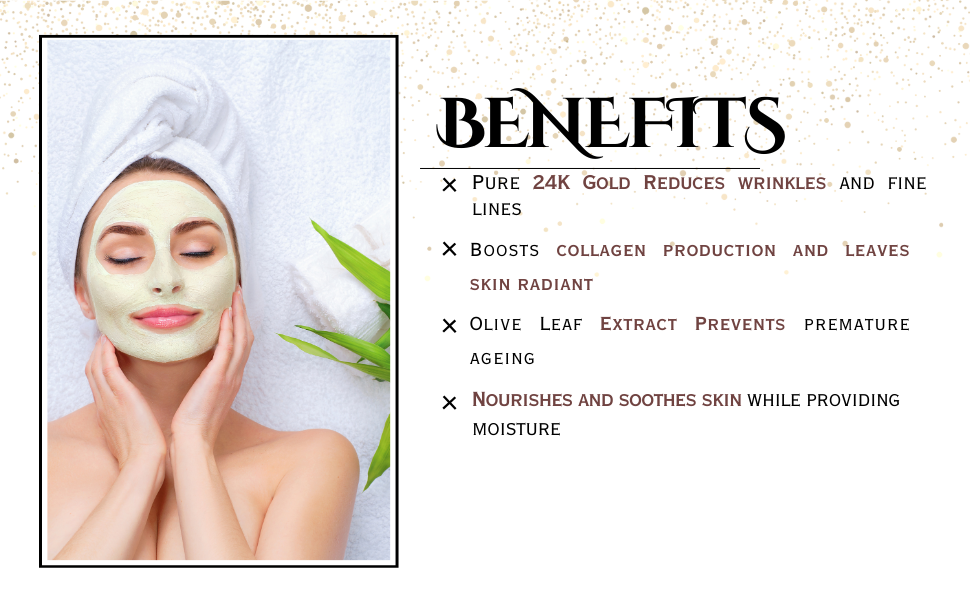 FACE MASK:luxurious 24k Gold Face Mask, the ultimate skincare indulgence designed to deliver a radiant glow and address hyperpigmentation. Infused with real 24k gold particles, this mask enhances your skin’s natural radiance, leaving it luminous and revitalized. Our advanced formula combines the brightening power of Vitamin C and niacinamide to effectively reduce dark spots and even out skin tone. These potent ingredients work synergistically to combat hyperpigmentation, revealing a clearer and more uniform complexion. In addition to its brightening benefits, the 24k Gold Face Mask offers powerful anti-aging properties. The gold particles stimulate collagen production, helping to reduce the appearance of fine lines and wrinkles, resulting in firmer, more youthful-looking skin.
