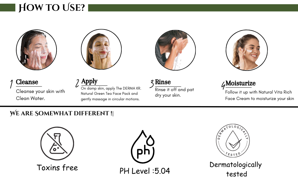 Description :-DERMA KR Green Tea Clean & Clear Face Mask." Green tea is often praised for its antioxidant properties, which can help to soothe and protect the skin from environmental stressors. However, the efficacy and suitability of any skincare product can vary greatly depending on individual skin types and sensitivities. If you're considering using this product, it's always a good idea to do a patch test first to ensure it won't cause any adverse reactions. Additionally, consulting with a dermatologist or skincare professional can provide personalized advice tailored to your specific needs.