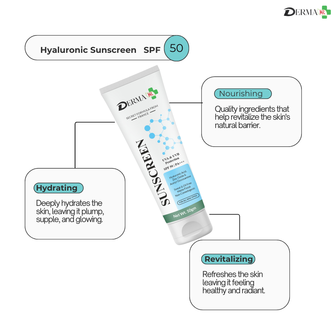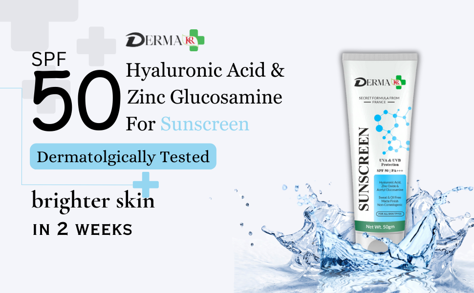 Description:-Sunscreen:-The ultimate blend of cutting-edge sun protection and deep hydration designed to revolutionize your skincare routine. DERMA KR innovative face sunscreen cream combines the unparalleled moisturizing power of hyaluronic acid with advanced SPF technology, delivering a product that not only protects your skin from harmful UV rays but also nourishes and enhances its natural radiance. HyaluGlow Sun Shield SPF is meticulously formulated to provide broad-spectrum protection against both UVA and UVB rays, which are responsible for sunburn, premature aging, and skin cancer. Unlike conventional sunscreens that may leave a greasy or heavy residue, HyaluGlow Sun Shield SPF offers a lightweight, non-greasy texture that absorbs quickly into the skin, making it perfect for daily use and suitable for all skin types, including sensitive skin.Whether you’re hitting the beach, going for a run, or simply spending the day outdoors, HyaluGlow Sun Shield SPF offers water-resistant protection that stays effective even during vigorous activities. This long-lasting formula provides continuous defence against UV rays, allowing you to enjoy your time in the sun without having to frequently reapply.