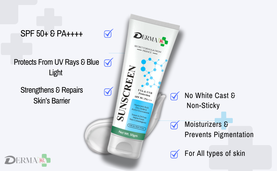 Description :-The ultimate blend of cutting-edge sun protection and deep hydration designed to revolutionize your skincare routine. DERMA KR innovative face sunscreen cream combines the unparalleled moisturizing power of hyaluronic acid with advanced SPF technology, delivering a product that not only protects your skin from harmful UV rays but also nourishes and enhances its natural radiance. HyaluGlow Sun Shield SPF is meticulously formulated to provide broad-spectrum protection against both UVA and UVB rays, which are responsible for sunburn, premature aging, and skin cancer. Unlike conventional sunscreens that may leave a greasy or heavy residue,