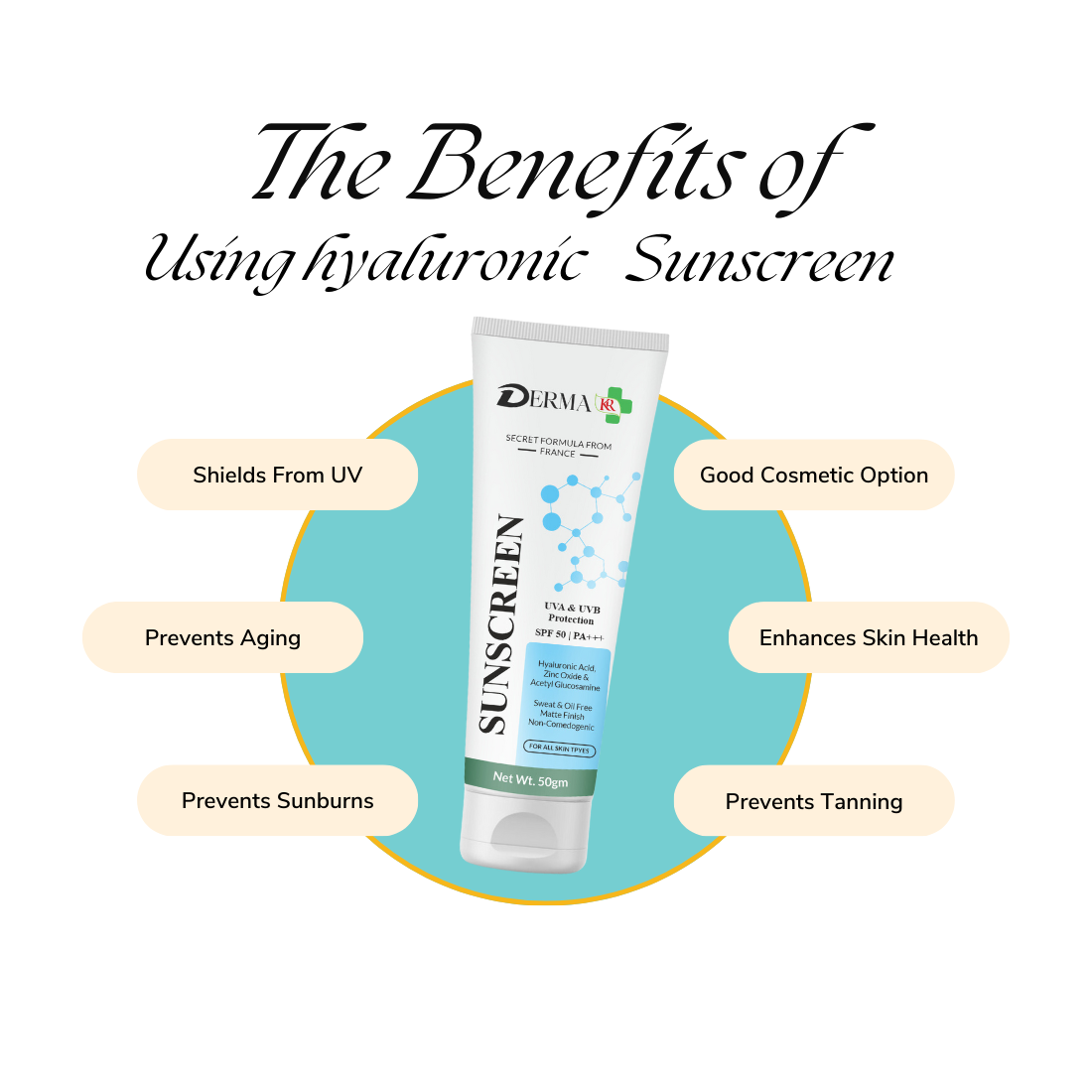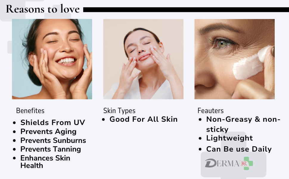 Description:-Sunscreen:-he ultimate blend of cutting-edge sun protection and deep hydration designed to revolutionize your skincare routine. DERMA KR innovative face sunscreen cream combines the unparalleled moisturizing power of hyaluronic acid with advanced SPF technology, delivering a product that not only protects your skin from harmful UV rays but also nourishes and enhances its natural radiance. HyaluGlow Sun Shield SPF is meticulously formulated to provide broad-spectrum protection against both UVA and UVB rays, which are responsible for sunburn, premature aging, and skin cancer.
