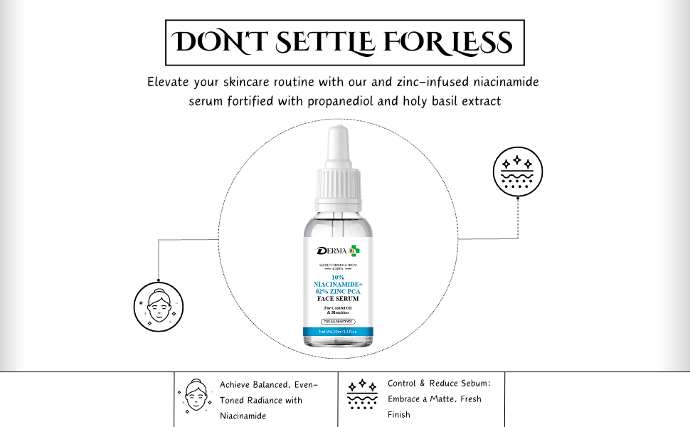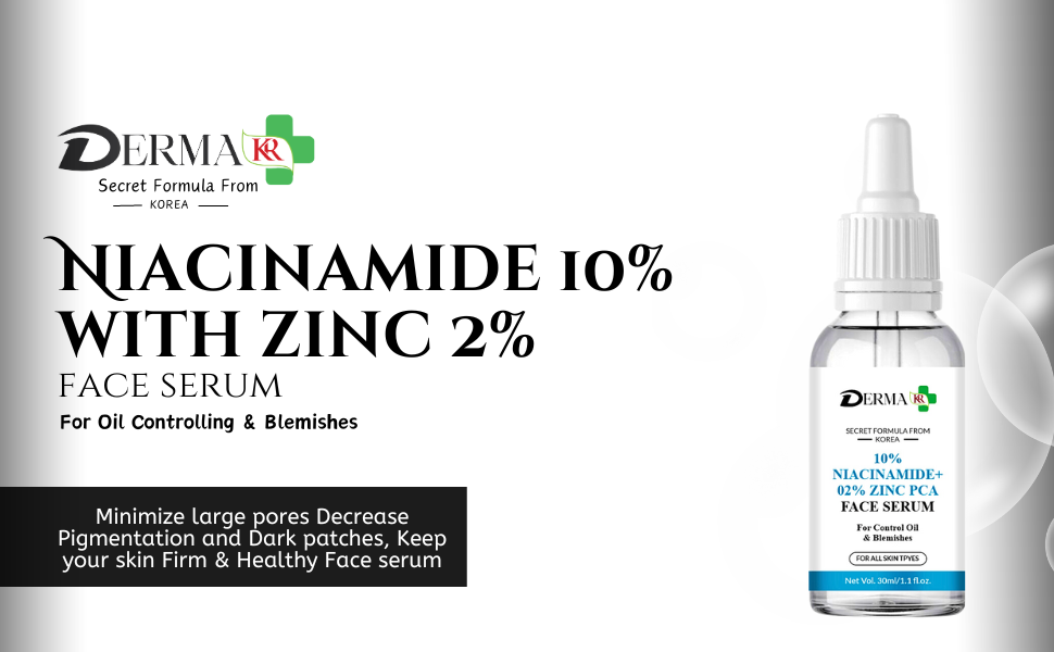 Description :- Transform your skincare routine with DERMA KR Niacinamide 10% + Zinc 2% Face Serum, a potent formula designed to target blemishes, balance oil production, and improve overall skin texture. Niacinamide, also known as Vitamin B3, is renowned for its powerful anti-inflammatory and skin-soothing properties. At a 10% concentration, it effectively minimizes the appearance of pores, reduces redness, and enhances skin clarity.Complementing the niacinamide, zinc PCA at a 2% concentration works to regulate sebum production, preventing excess oil that can lead to breakouts.
