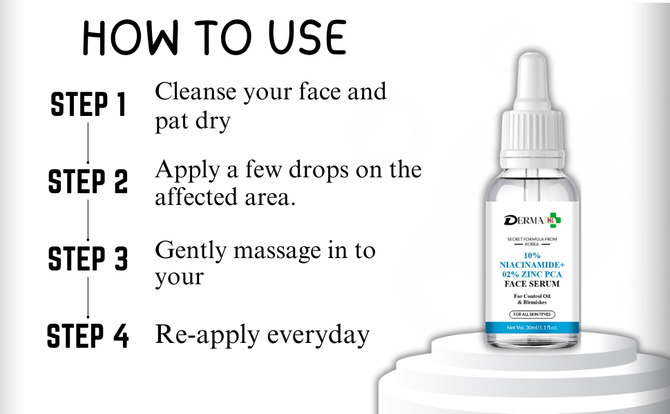 To incorporate into your skincare routine, apply a few drops to your face in the morning and evening before heavier creams. With consistent use, you'll notice a significant improvement in skin texture and tone, along with a reduction in blemishes and excess oil. Free from parabens, sulfates, and phthalates, this cruelty-free serum is gentle on the skin while delivering powerful results. Achieve a clearer, more balanced complexion with DERMA KR Niacinamide 10% + Zinc 2% Face Serum.