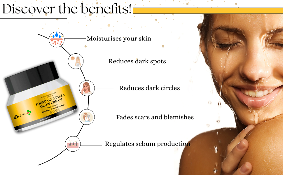 Description:-Face Cream:-DERMA KR Soundarya Glow Cream with 24K Gold. This exquisite cream is formulated with pure 24K gold particles to rejuvenate and illuminate your skin. Designed to boost collagen production, it enhances skin elasticity and firmness, reducing the appearance of fine lines and wrinkles for a youthful, radiant glow. Enriched with natural botanicals and powerful antioxidants, this cream deeply nourishes and hydrates the skin, promoting a smooth and even complexion.