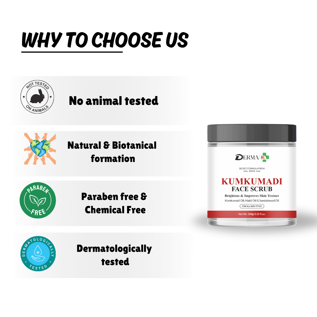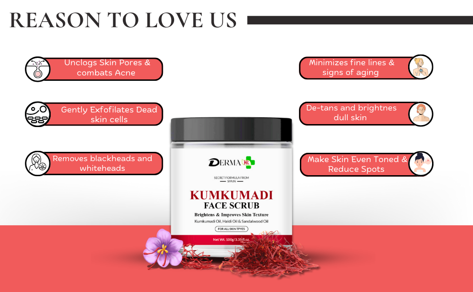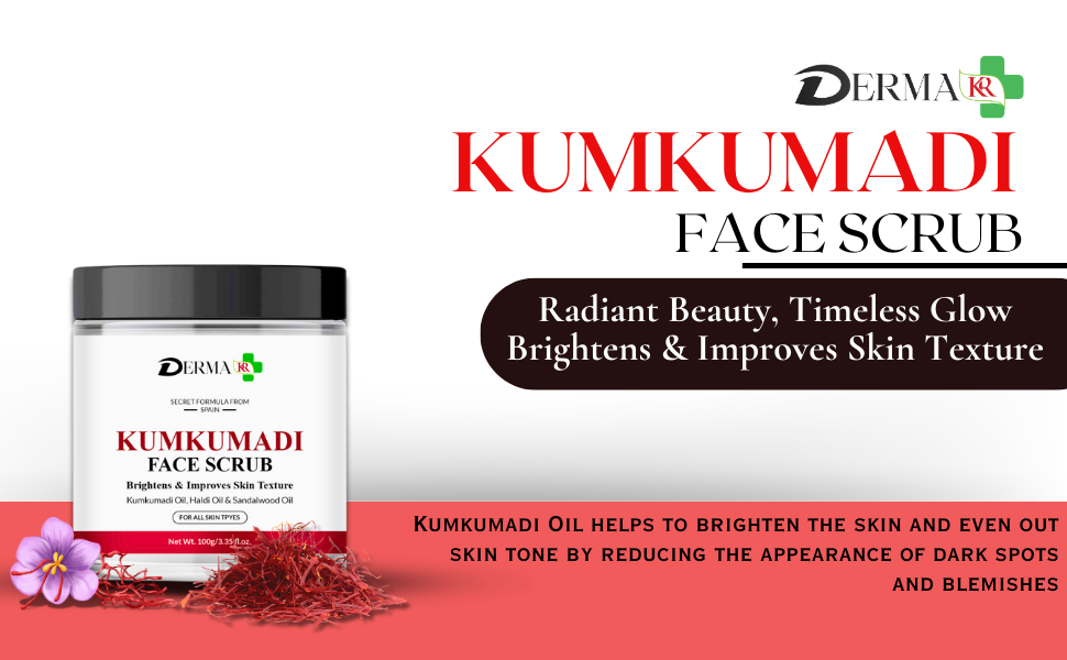 Description :-DERMA KR Kumkumadi Face Scrub, a rejuvenating blend infused with the ancient beauty secrets of Kumkumadi oil. Crafted to gently exfoliate, brighten, and rejuvenate your complexion, this scrub offers a spa-like experience in the comfort of your own home. At the heart of our formula lies Kumkumadi oil, an ancient Ayurvedic blend of potent herbs and oils renowned for its skin-brightening and anti-aging properties. Combined with natural exfoliants like finely ground almonds or oatmeal, our scrub delicately buffs away dead skin cells, revealing a smoother and more radiant complexion. Enriched with saffron, turmeric, and other Ayurvedic herbs, our scrub helps diminish the appearance of dark spots, hyperpigmentation, and uneven skin tone, promoting a more luminous and even complexion.