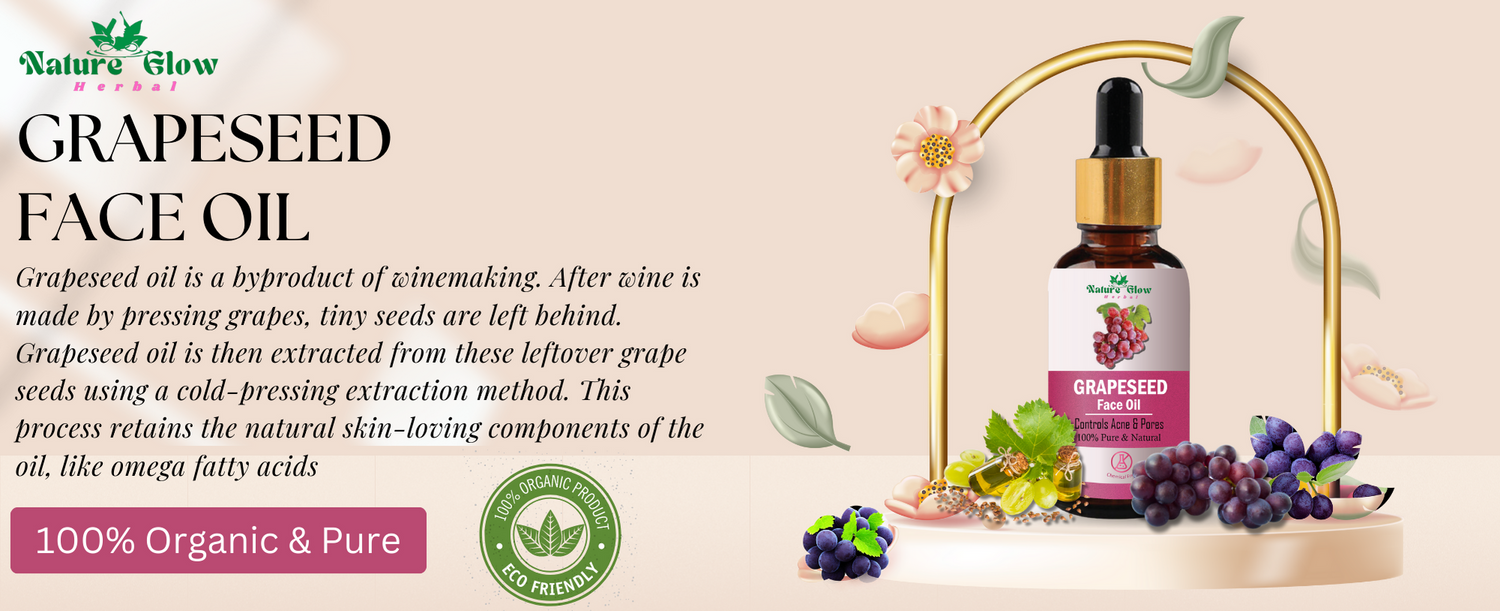 GrapeSeed :-Use Nature Glow GrapeSeed Facial Oil to discover the secret to naturally radiant skin. Our cold-pressed, organic formula is meant to raise your skin and leave it looking radiant and youthful.Rich in vitamin E and grape seed oil, this facial oil works as a strong, organic anti-aging potion. It makes substantial moisture and assists in smoothing wrinkles and fine lines. All skin types can use it to benefit from its lightweight, quickly absorbing formula, which leaves no greasy aftertaste.Include this useful skincare potion in your normal daily regimen. Our GrapeSeed Facial Oil provides the nourishment your skin longs for, whether it is used as an independent a moisturiser or paired together with your preferred skincare products. With Nature Glow, you can embrace the beauty of nature and improve your skincare routine.