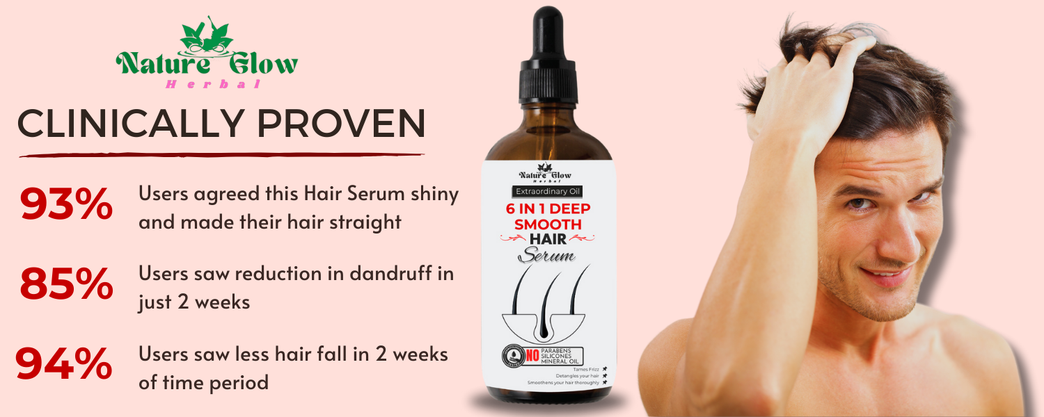 Description :-With Nature Glow 6-in-1 Deep Smooth Hair Serum, treat your hair to the opulent care it deserves. With its revolutionary formula, your hair will be transformed while receiving intense hydration, nourishment, and unmatched smoothness. Our serum, which is enriched with a combination of natural extracts and vital vitamins, works to revitalise your hair from the inside out, encouraging a lustrous and well-groomed mane.
