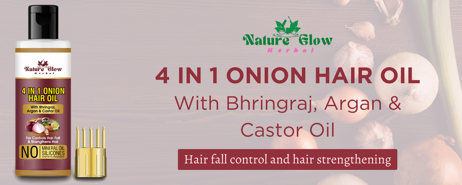 Description:-Nature Glow's 4-in-1 Oil, a synergistic blend of castor, onion, and Bhringraj oils, will uplift your hair care regimen. This special elixir gives your hair intense nourishment from root to tip by combining the revitalising qualities of onion and argan oils. The strengthening effects of Castor oil fortify your strands, protecting them against damage and breakage. In the meantime, your scalp is stimulated by the strong Bhringraj oil, which encourages healthy hair growth.Bid farewell to laborious hair care regimens; our 4-in-1 formula streamlines the procedure and provides a complete solution for hair that is nourished, resilient, and shiny. With a focus on using only natural and potent ingredients, Nature Glow makes sure that your hair gets the attention it needs. Discover the key to stunning, renewed hair with Nature Glow's.