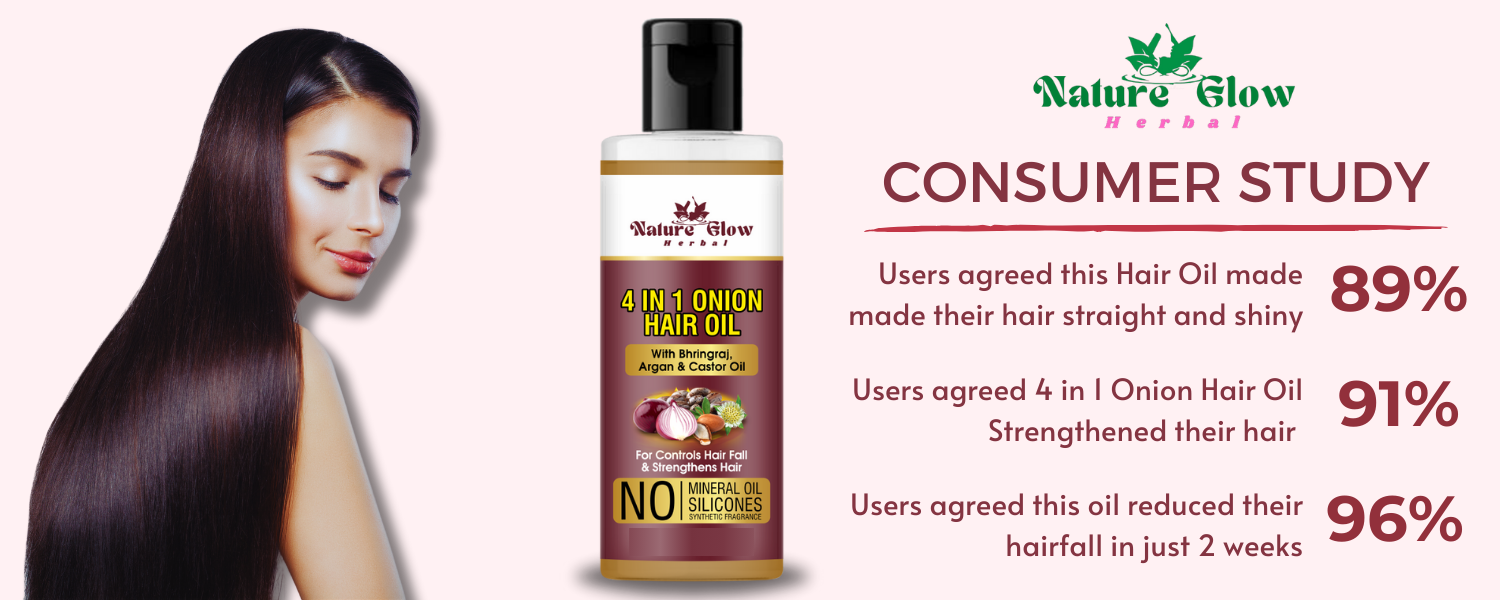 Strong Blend: Discover the enchantment of Nature Glow's exemplary 4-in-1 hair oil, skilfully blended with the benefits of castor, onion, and bhringraj oils.