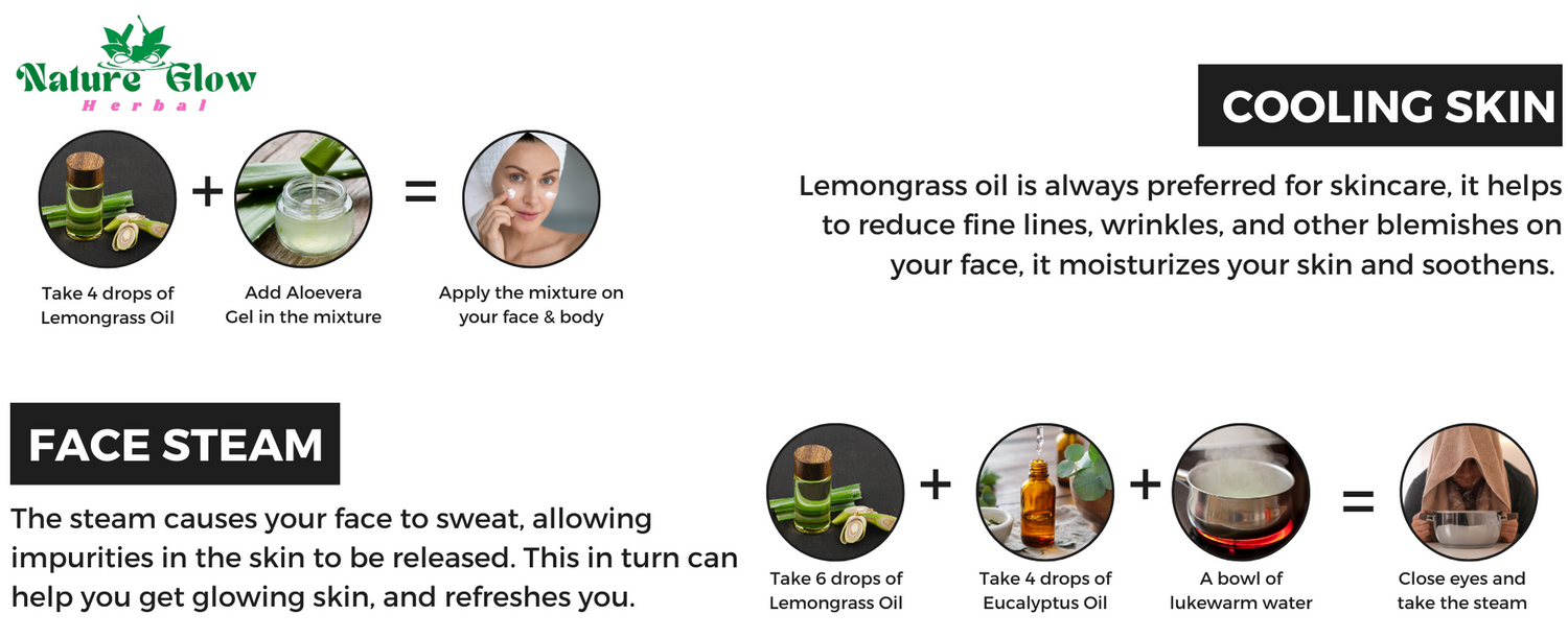 Take 2-3 dropes of Lemongrass Essential oil and mix with carrier oil.Gently apply on skin,Hair, boday.