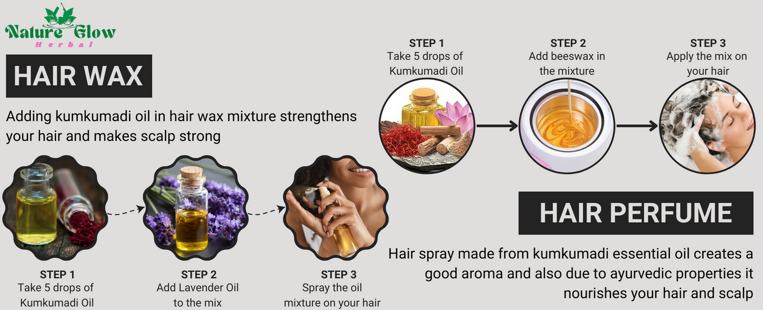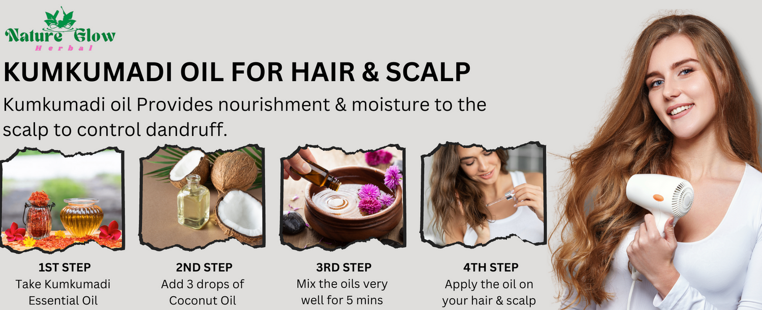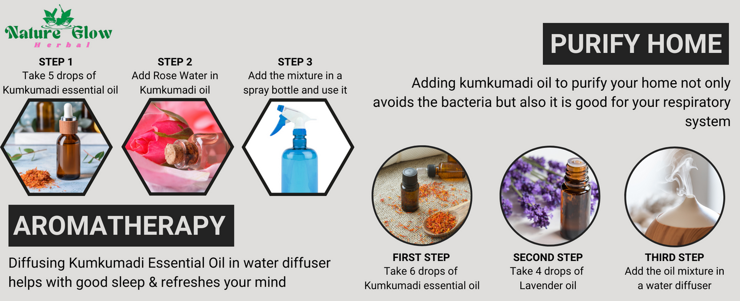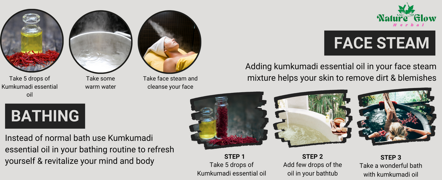 Take 2-3 dropes of Kumkumandi Essential oil and mix with carrier oil.Gently apply on skin,Hair, boday