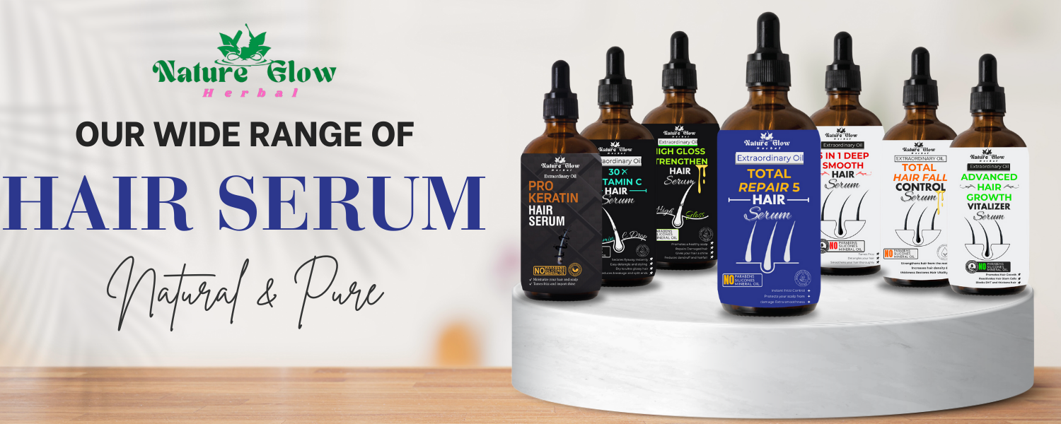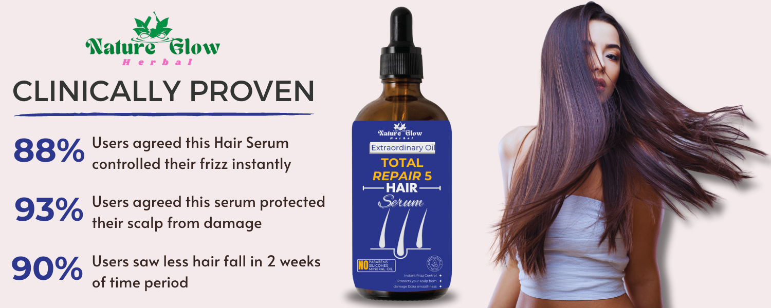 Description :-With Nature Glow Total Repair 5 Hair Serum, you can unlock the key to gorgeous, salon-worthy hair. Our cutting-edge formula uses the strength of natural ingredients to give your hair deep repair, hydration, and frizz control.
