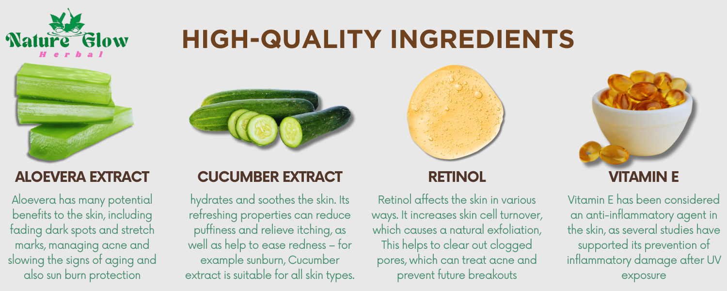 Description :-With Nature Glow Under Eye Cream, find out the key to younger, brighter eyes. Our sophisticated formula targets common under-eye issues like puffiness, fine lines, and dark circles by combining the power of natural ingredients.