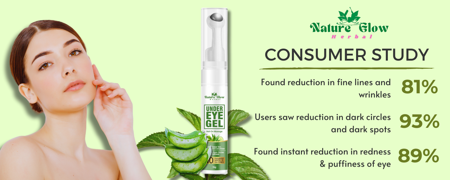 - Green Tea Powerhouse: This under-eye gel, enhanced by the antioxidant qualities of green tea, fights free radicals, encouraging skin elasticity and resilience while reducing the appearance of ageing signs.Green tea extract-infused Nature Glow Under Eye Gel Roll-On: An All-Natural Puffiness and Dark Circle Treatment for Brighter Eyes
