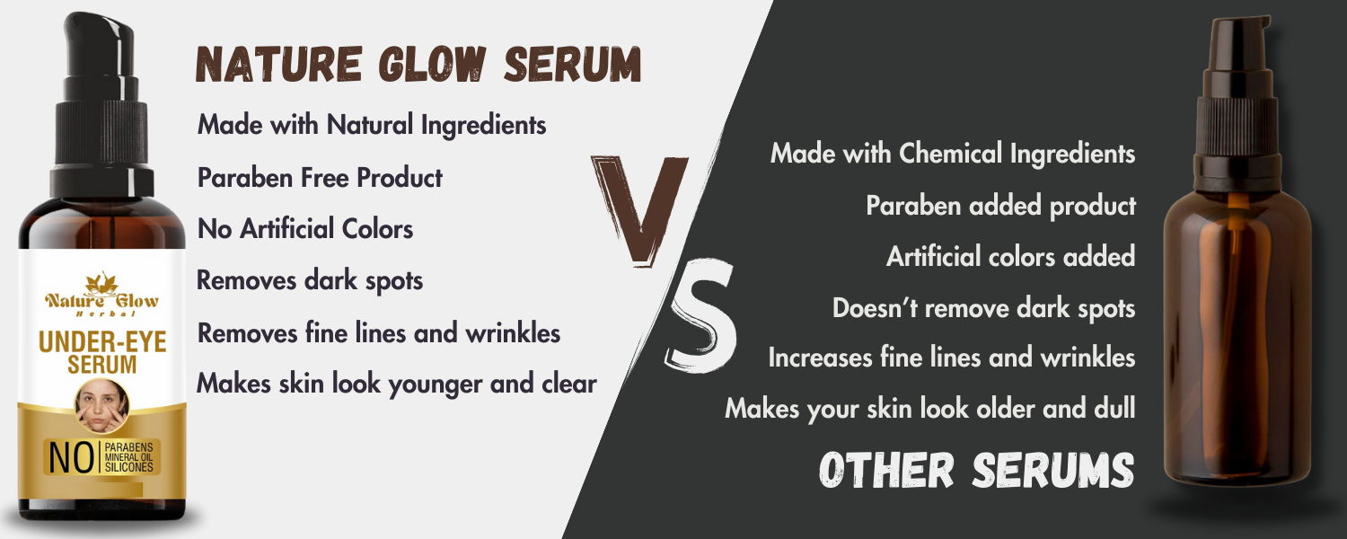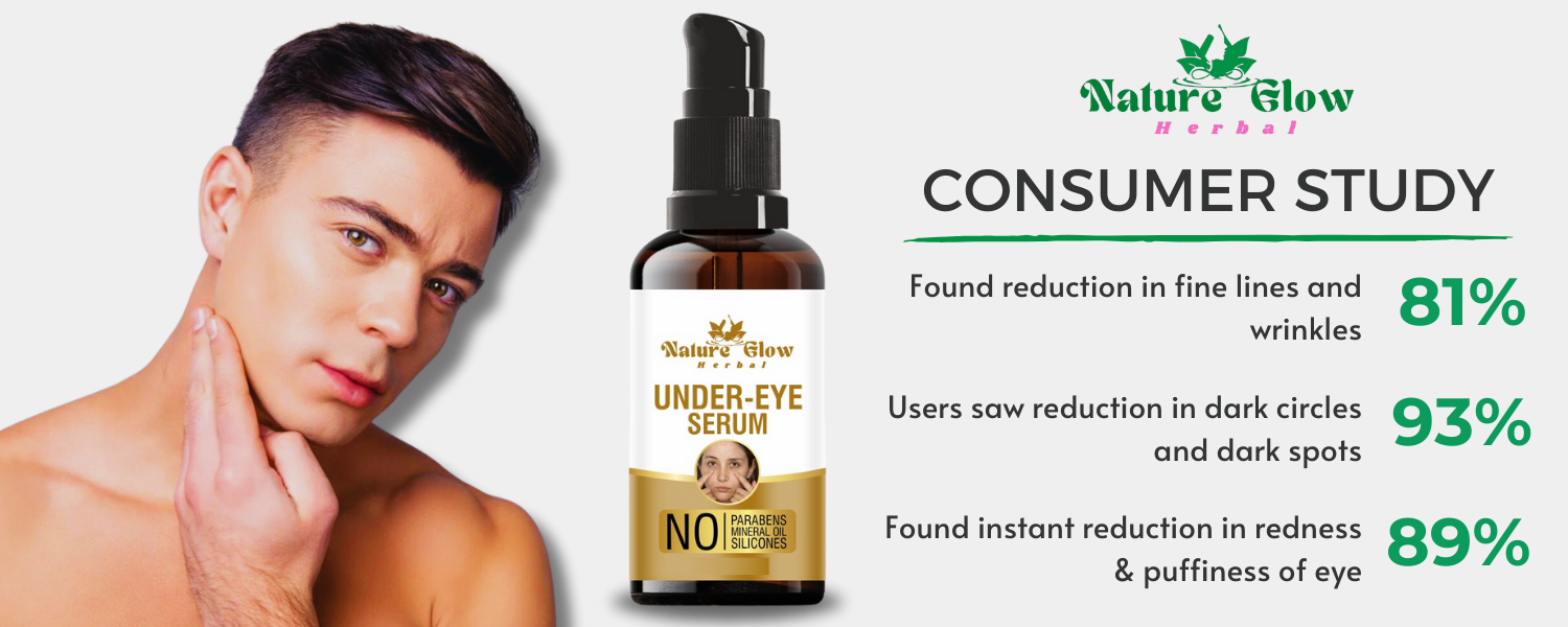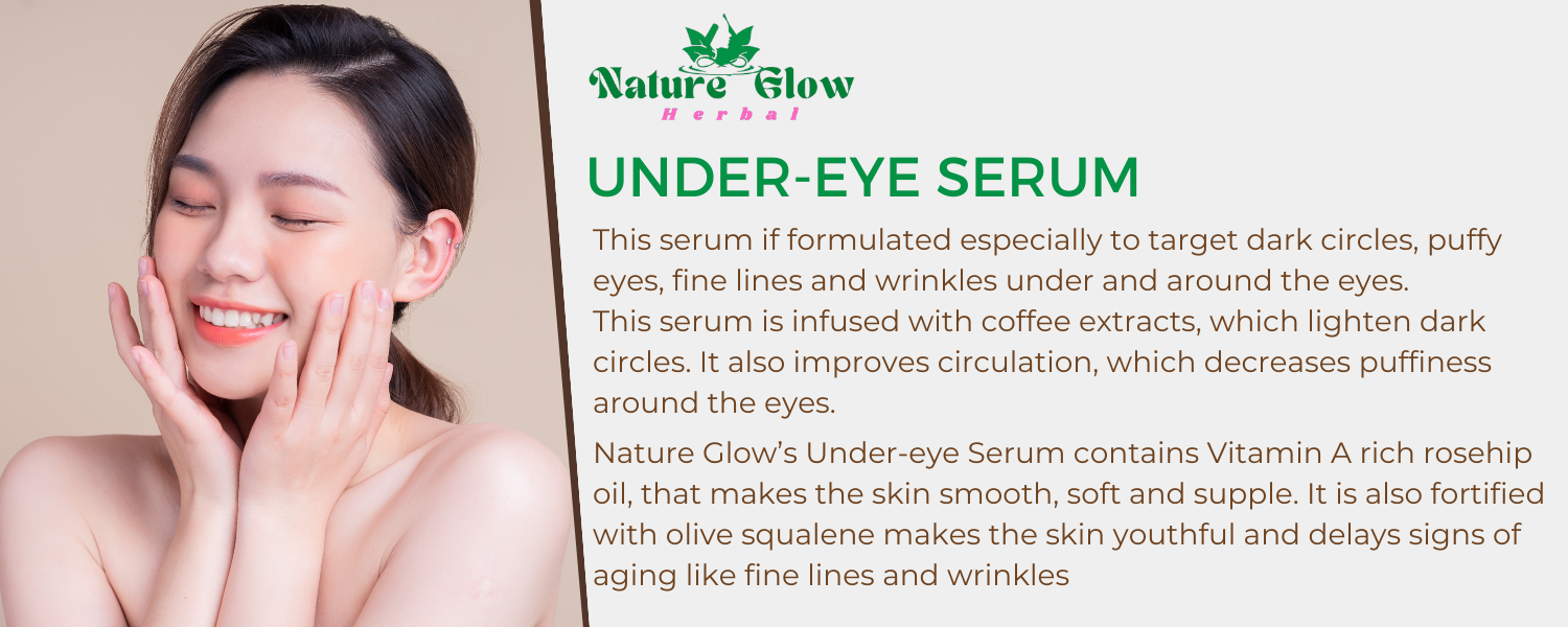 DESCRIPTION:- With Nature Glow Under Eye Serum, you can uncover the key to radiant, renewed eyes. Our sophisticated formula targets common under-eye concerns by carefully blending natural ingredients like vitamin C and hyaluronic acid.