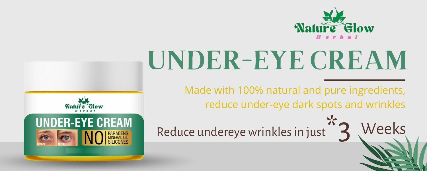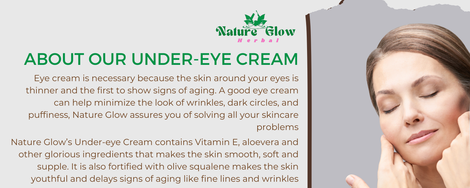 Cream :-With Nature Glow Under Eye Cream, find out the key to younger, brighter eyes. Our sophisticated formula targets common under-eye issues like puffiness, fine lines, and dark circles by combining the power of natural ingredients. Our cream, enhanced with [important ingredients], brightens and revitalises while also adding hydration for a look that is renewed and radiant. Bid farewell to eyes that appear tired and hello to a refreshed, younger version of yourself. All skin types can benefit from our mild and non-irritating formula, which makes it a flexible addition to your regular skincare regimen. Use Nature Glow to change the way you take care of your sensitive eye area.
